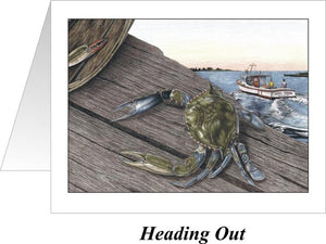 Hand-drawn "Heading Out" image depicts a blue crab resting on a wooden dock board as the crab boat in the background heads out on its commute to begin work on Maryland's Eastern Shore.