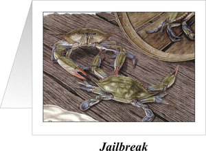 Hand-drawn "Jailbreak" image depicts the Atlantic or Chesapeake Blue Crab escaping from a crab basket driftwood board upon the sand, and leading another crab to do the same. Here's that image on stylish note cards.